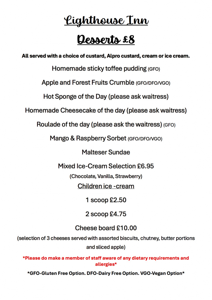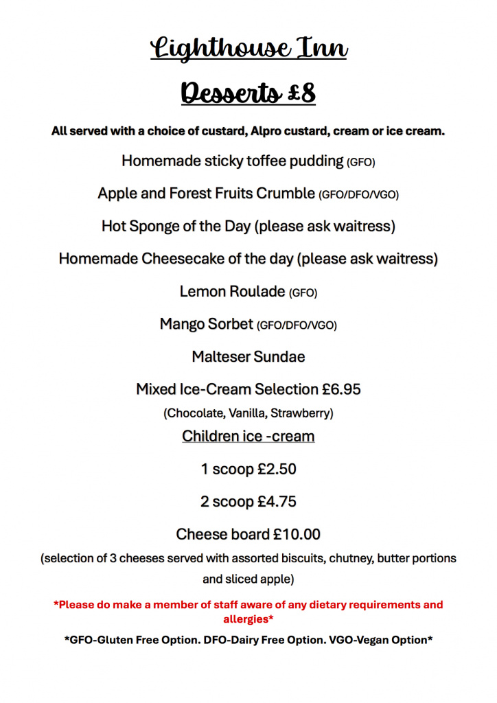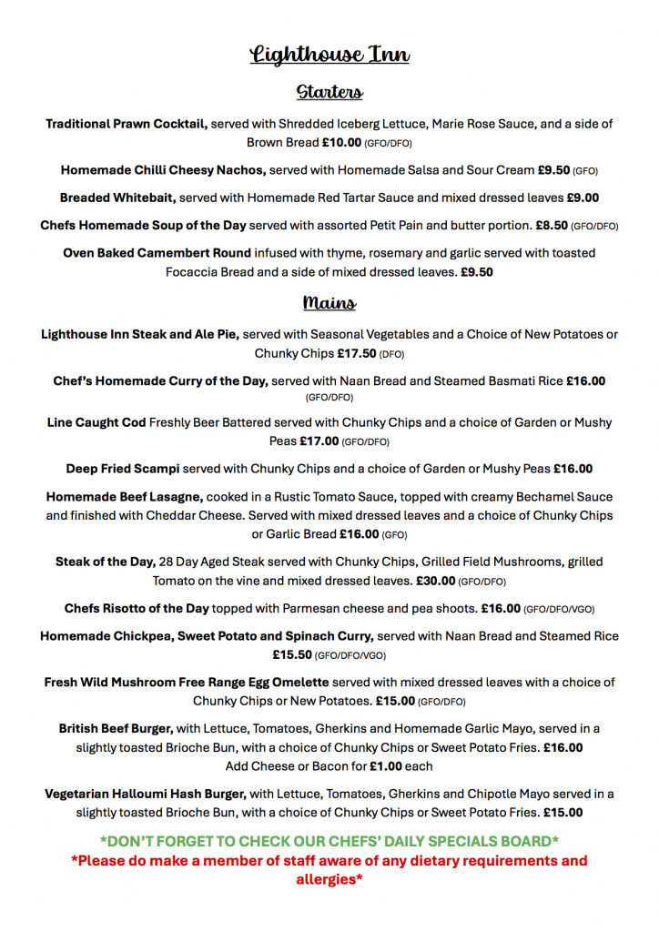 Our menu features our famous Lighthouse pies, fresh local seasonal seafood with a great range of vegetarian and vegan choices. We offer delicious and healthy children’s options and light snacks too. Our daily specials feature the very best of local Read More ...